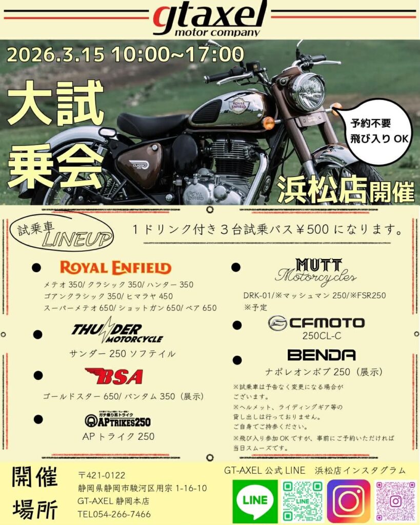 BSA販売店GT-AXEL浜松店様店頭にて大試乗会が開催されます。